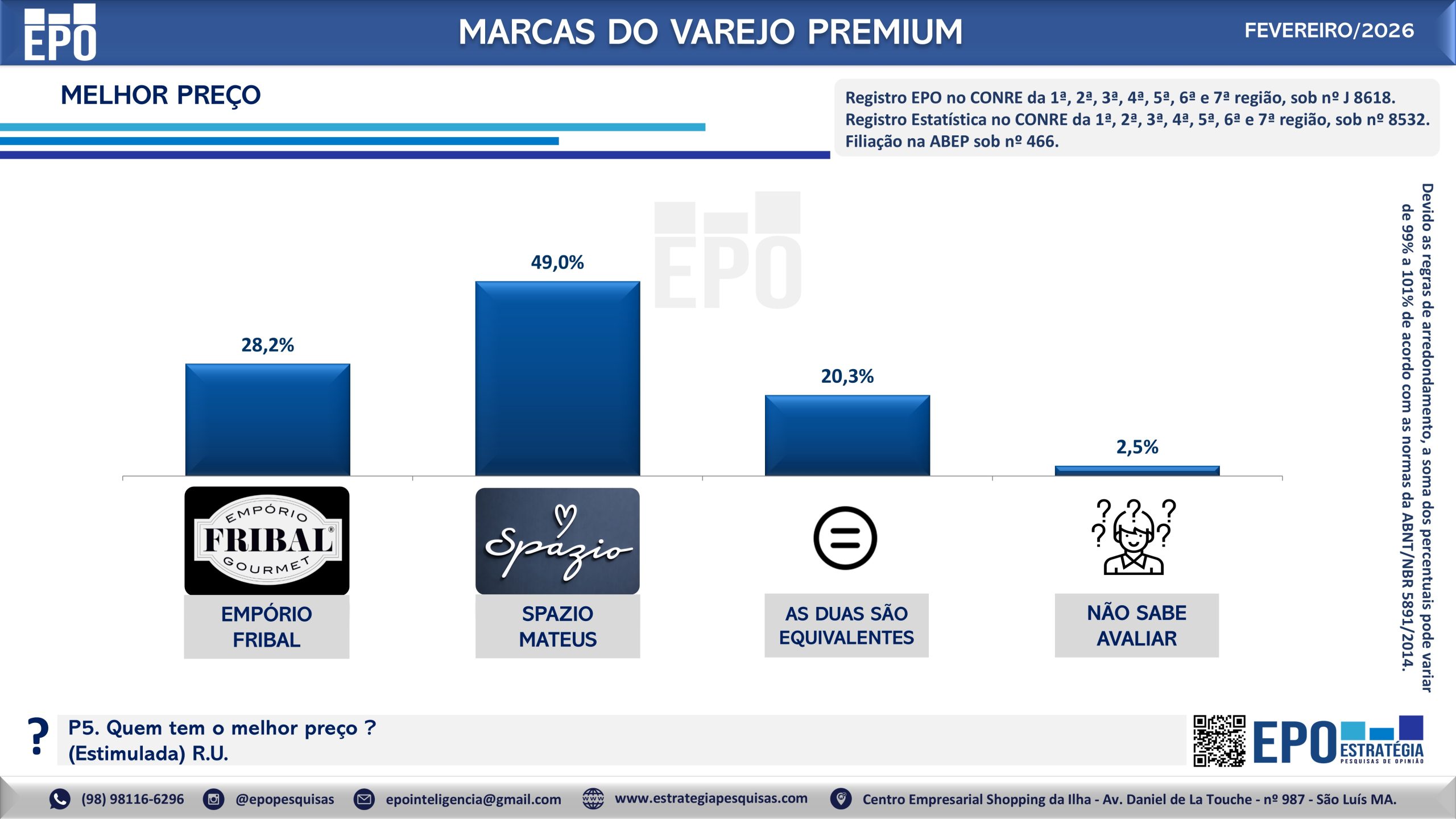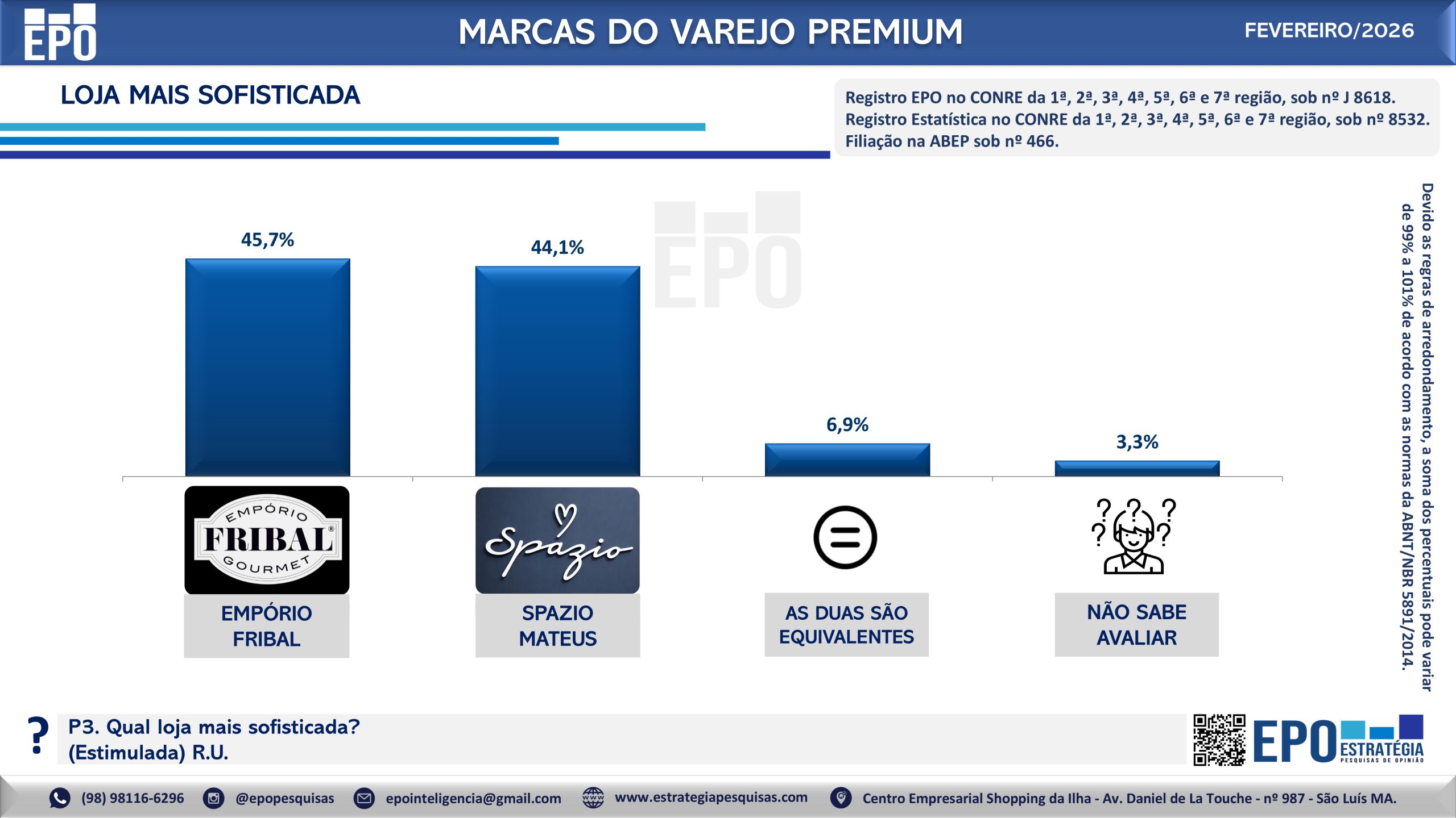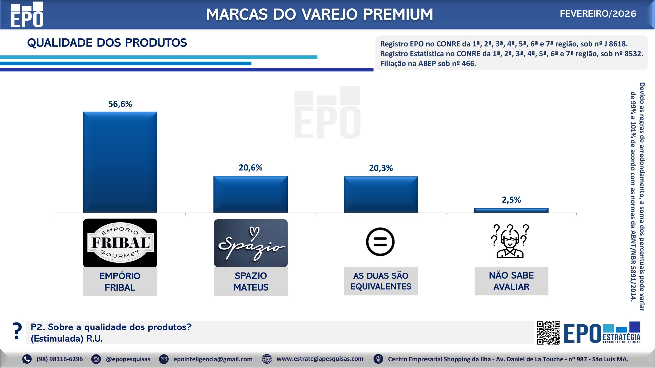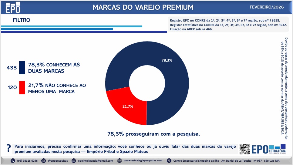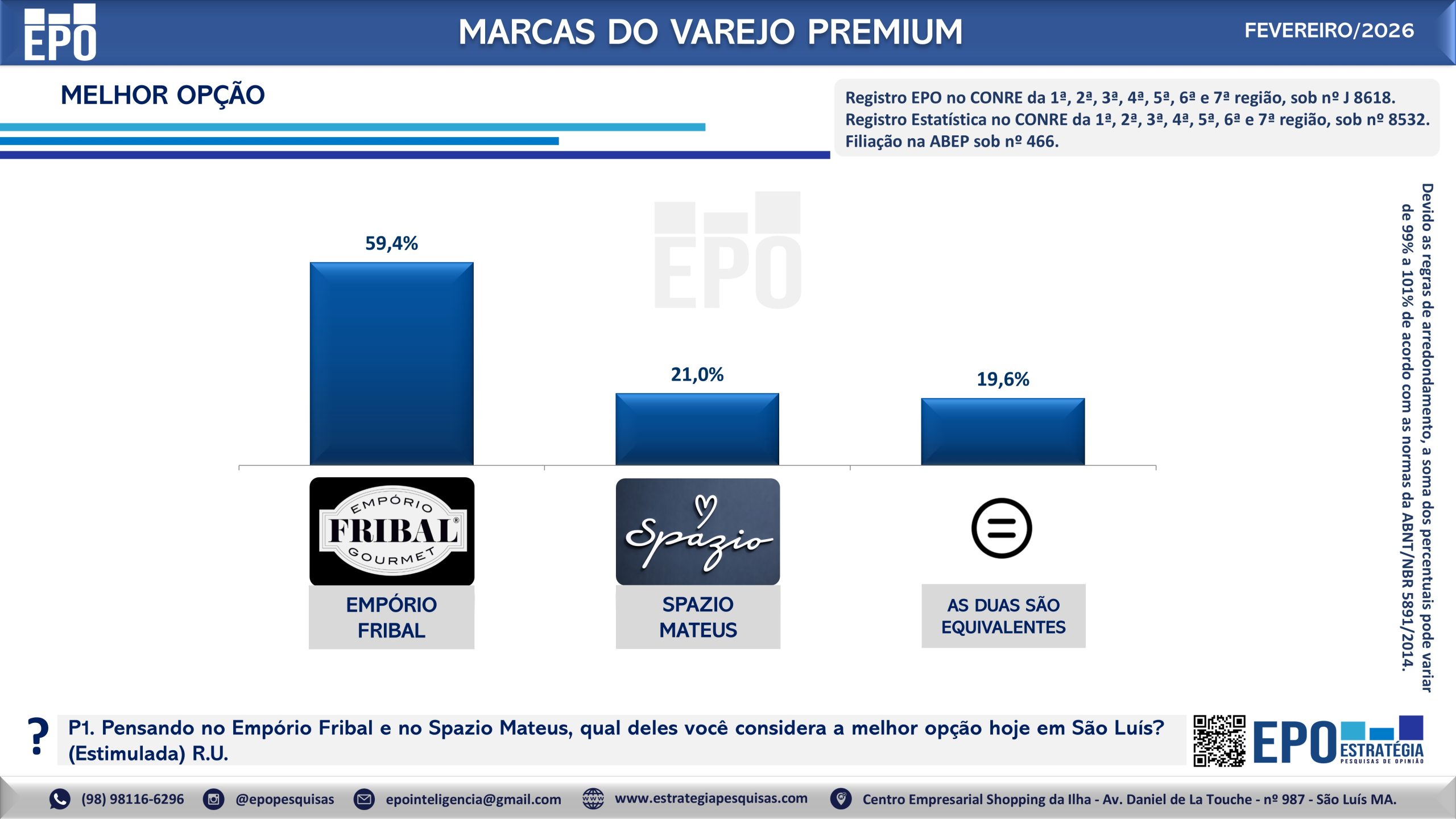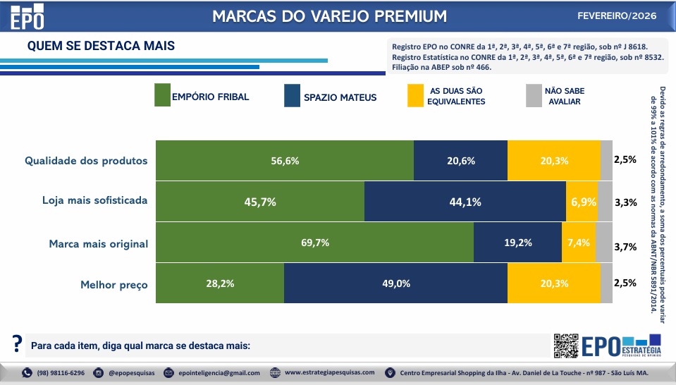 Uma pesquisa realizada pelo Instituto EPO em parceria com a DNA Comunicação mostra que 78,3% dos consumidores ludovicenses afirmam conhecer a Empório Fribal e o Spazio Mateus, que são duas das principais marcas do segmento premium ou gourmet na capital maranhense.