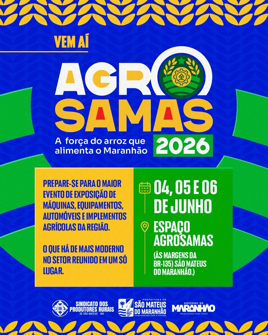 SÃO MATEUS DO MARANHÃO – O município realiza, entre os dias 4 e 6 de junho, a 2ª edição da AgroSamas 2026, feira voltada à exposição de máquinas, equipamentos e tecnologias agrícolas. O evento ocorrerá no Espaço AgroSamas, às margens da BR-135, e deve reunir grandes marcas do setor, consolidando-se como uma das principais iniciativas do agronegócio na região.