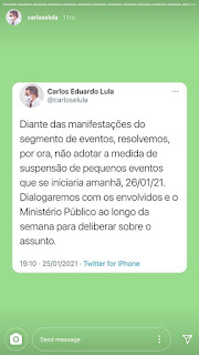 A proibição entraria em vigor nesta terça-feira, 26 de janeiro de 2021. Mas agora deve ser mantida a decisão da portaria de agosto que liberava eventos de pequeno porte.