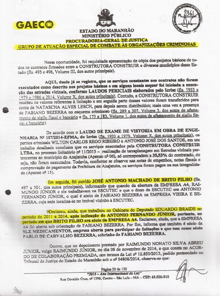 No depoimento prestado por Raimundo Júnior ao Gaeco, um trecho grave chama a atenção: todo o dinheiro que Brito Júnior recebia como funcionário fantasma na AL-MA era repassado ao próprio Eduardo Braide, por meio de uma outra pessoa envolvida no esquema criminoso e também funcionária fantasma no gabinete do parlamentar, Matilde Sodré Coqueiro. Ela também era, segundo as investigações do Gaeco e do Ministério Público Federal (MPF) compartilhadas com a Polícia Federal, secretária de Fernando Júnior na Escutec e funcionária de outra empresa de fachada criada e operada por Fabiano Bezerra, Fernando Júnior e Carlos Braide, a Vieira e Bezerra Ltda – ME.