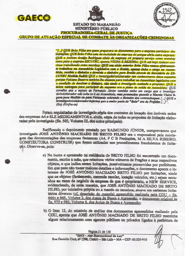 De acordo com as investigações, a ilegalidade ocorreu entre os anos de 2011 e 2014, e foi revelada aos promotores de Justiça Gladston Fernandes de Araújo, Marco Aurélio Cordeiro Rodrigues e Marcos Valentim Pinheiro Paixão, durante oitiva com o sócio de Brito Filho na empresa A4 Serviços e Entretenimento, Raimundo Nonato Silva Abreu Júnior. Ambos, segundo o Gaeco, eram laranjas, na empresa de fachada.