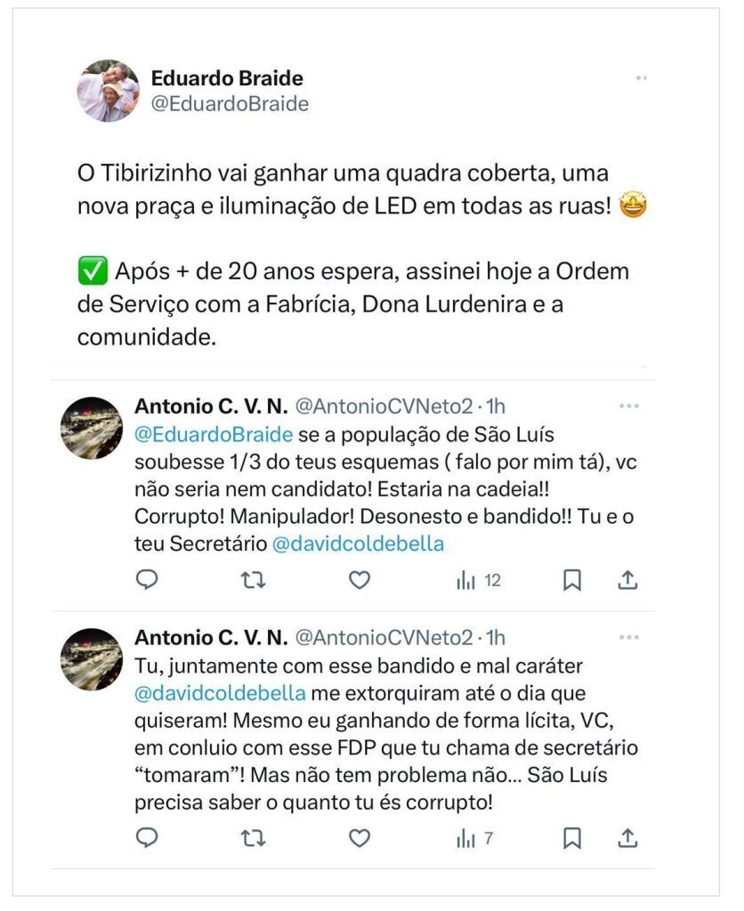 No dia 29 de maio, quando Braide publicou na rede social, um vídeo prometendo uma nova praça e iluminação de LED no bairro Tibirizinho, o empreiteiro fez dois comentários na publicação com acusações contra o chefe do Executivo. Em seu comentário, taxou o prefeito de corrupto, manipulador, desonesto e bandido.