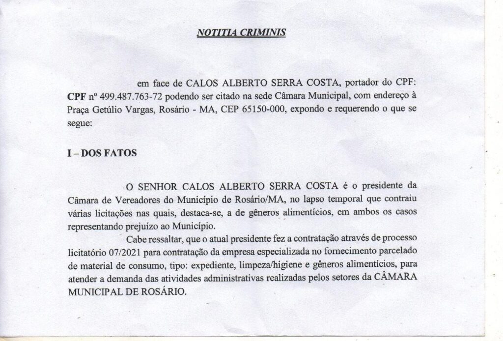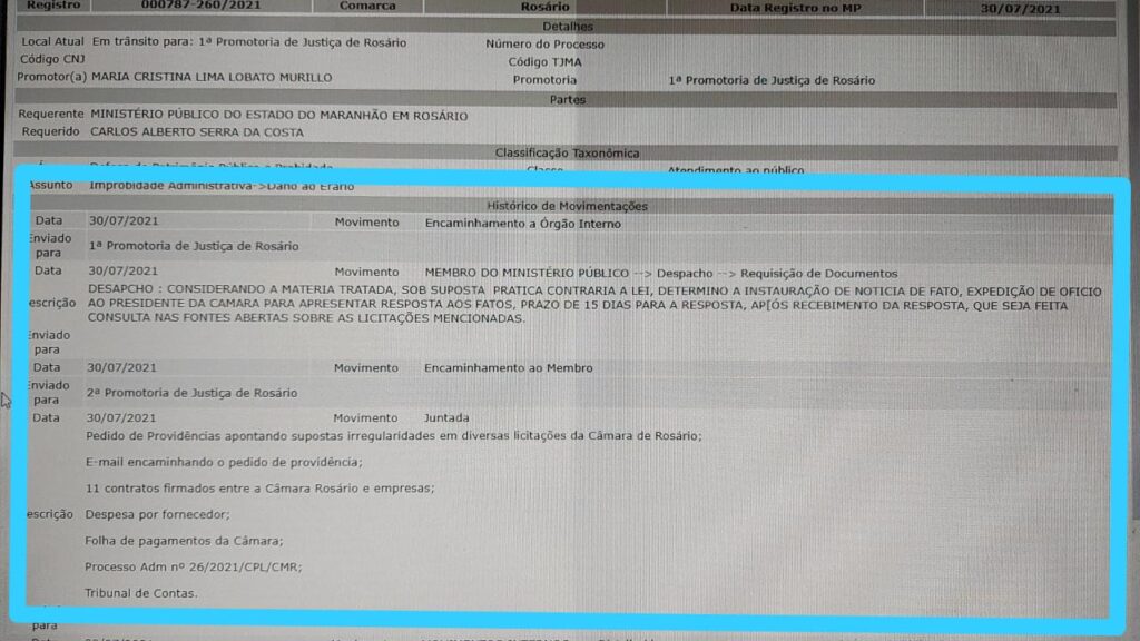 O Ministério Público de Maranhão por intermédio da 1ª Promotoria de Justiça de Rosário instaurou, no dia 30 de julho, notícia de fato para apurar as diversas irregularidades em licitações da Casa Legislativa. A abertura do procedimento se baseou em denúncias feitas por populares e notícias jornalísticas veiculadas na imprensa.