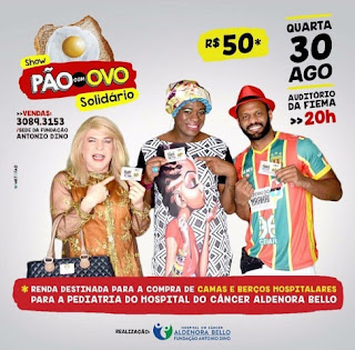 Lembrando que toda a renda do show será destinada para a compra de camas e berços hospitalares para a pediatria do Hospital do Câncer Aldenora Bello. Uma excelente oportunidade para se divertir e ajudar as crianças com câncer! Os ingressos podem ser encontrados na sede administrativa da Fundação Antonio Dino, Loja Camarim Moda na Holandeses e na loja Ingressando do Shopping São Luís em horário comercial. Lembrando que os Ingressos são limitados!